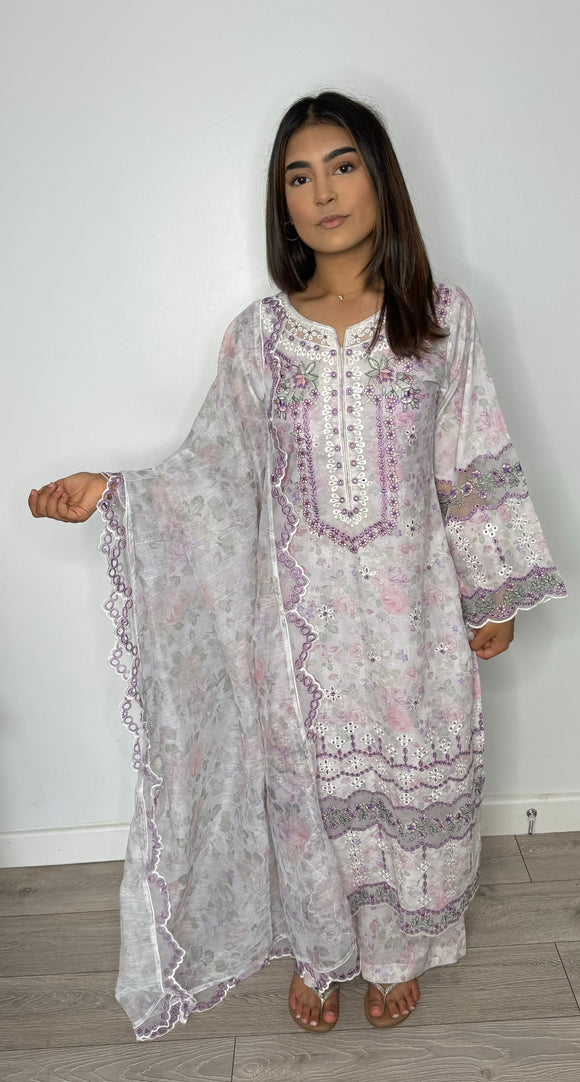 'Imaani' 3 Pc Chickan Kari with Printed Dupatta - Grey