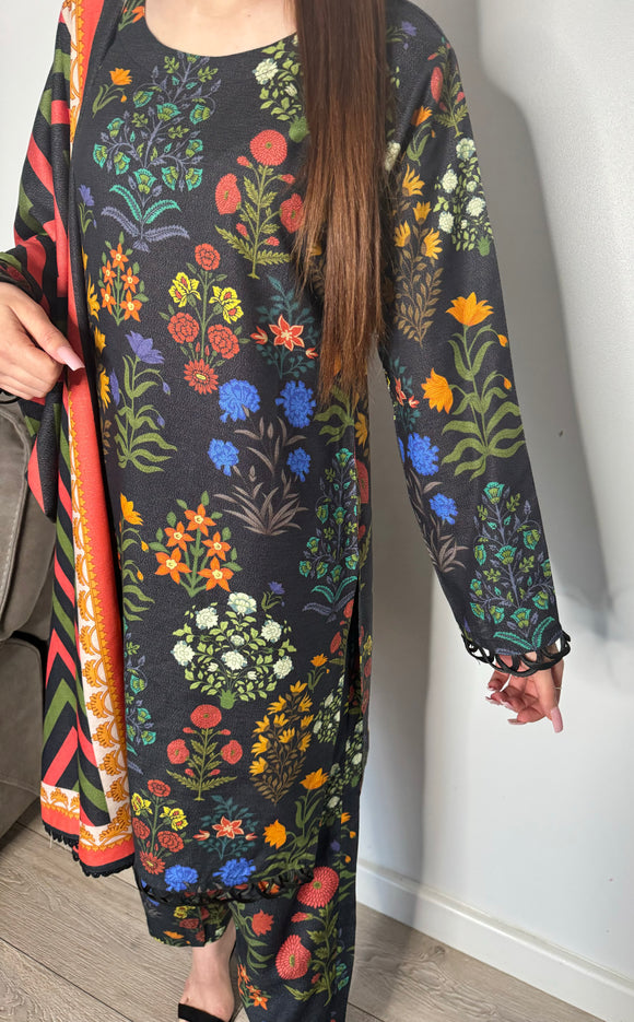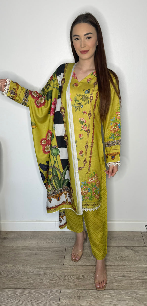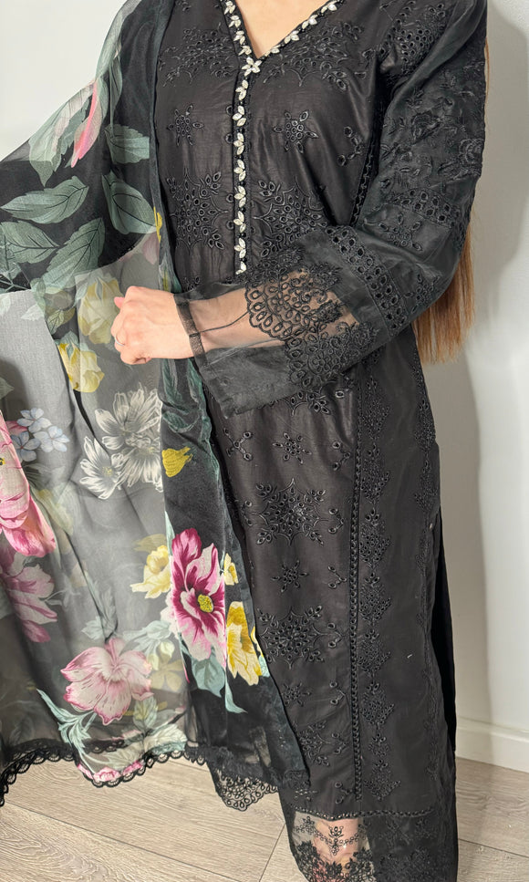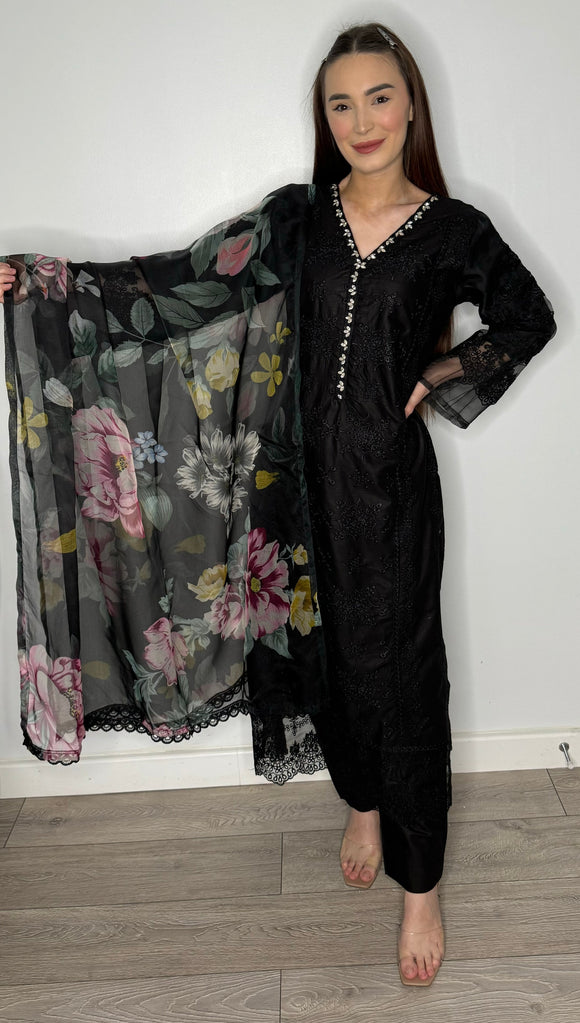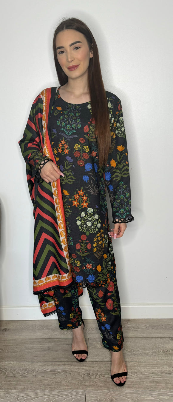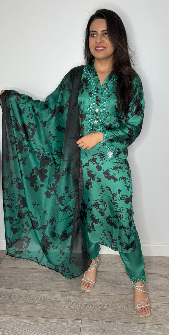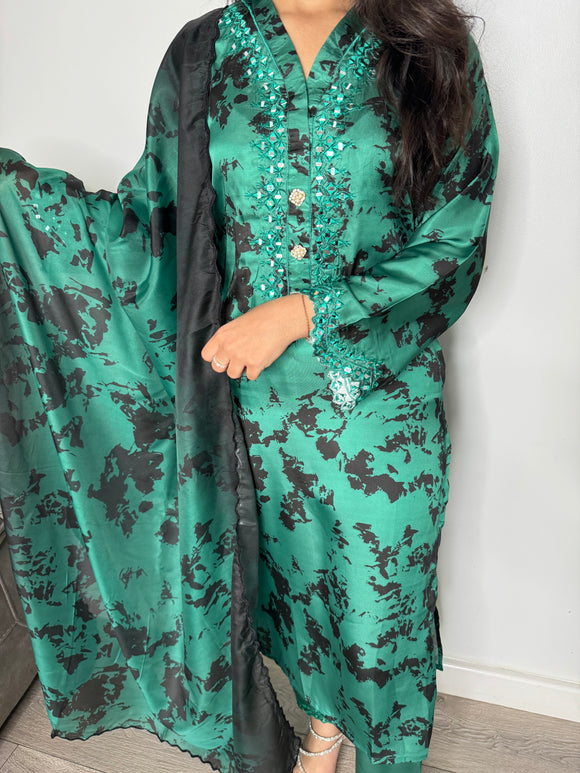 Faryal 3 Pc Silk Pret Collection Suit - Green and Black