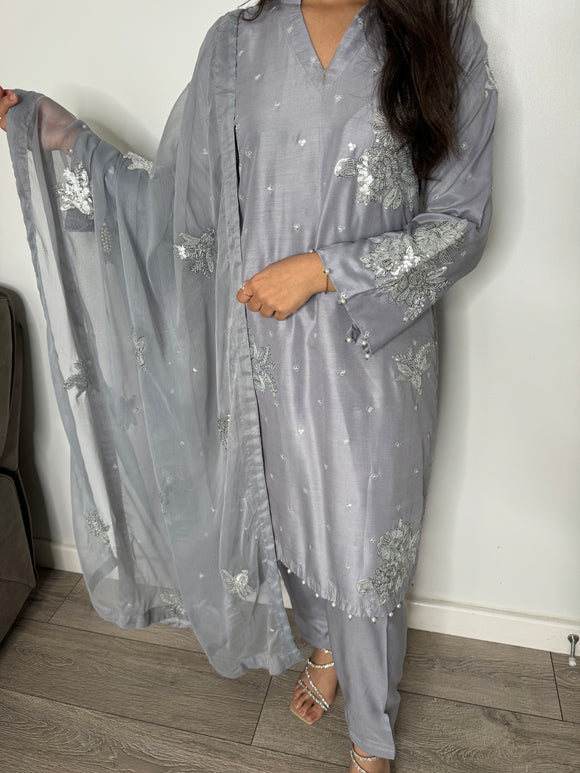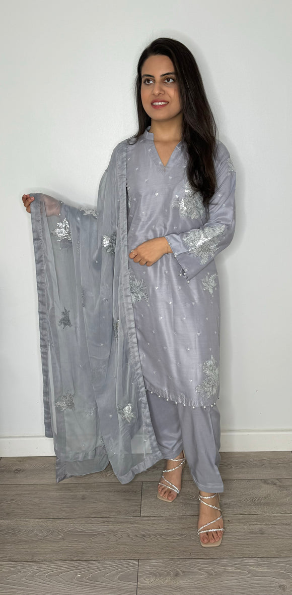 3 Pc Pret Sequence Suits with Chiffon Dupatta - Grey