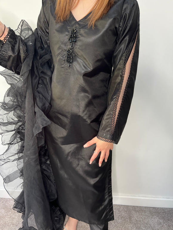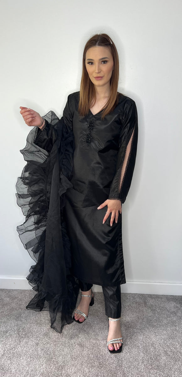 2 Pc Satin Silk Suit - Black (Kameez and Capri)