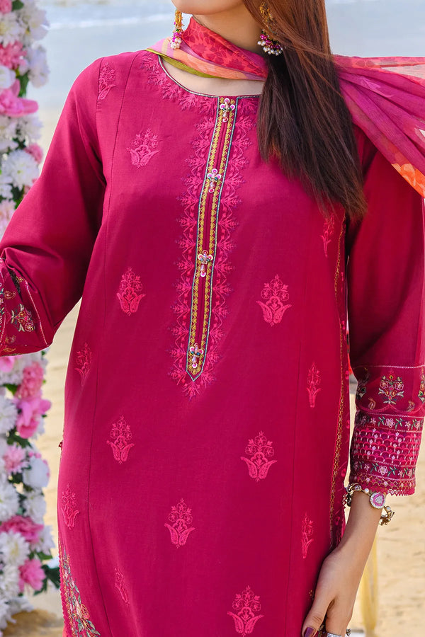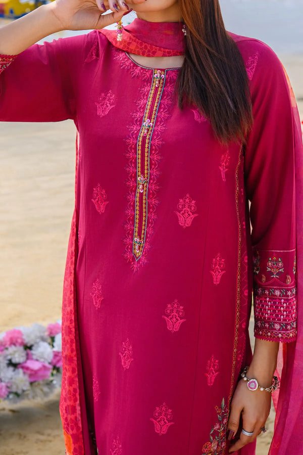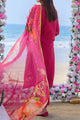An exuberant and exquisitely embroidered design shines in a vibrant fuchsia tone. Its intricate threadwork depicts intricate flora in deep pink hues. Paired with a vibrantly printed dupatta showcasing vivid colours, this design seamlessly blends modern and traditional elements for an elegant look.