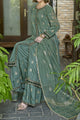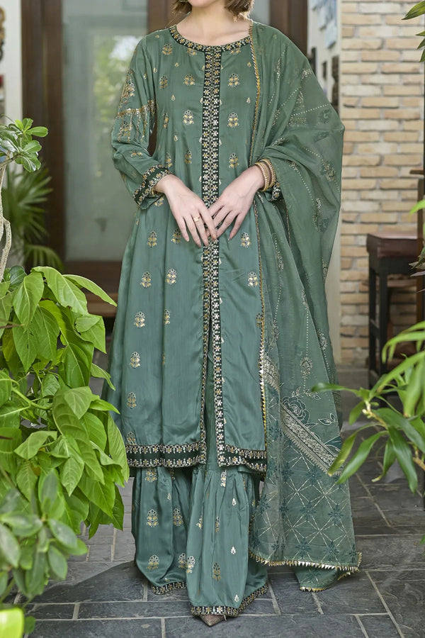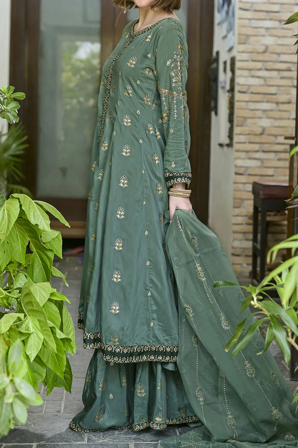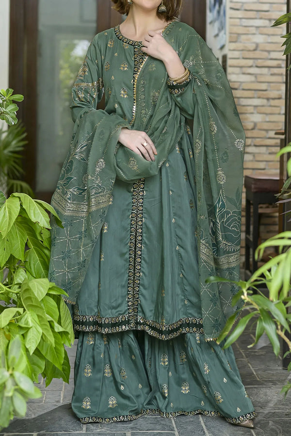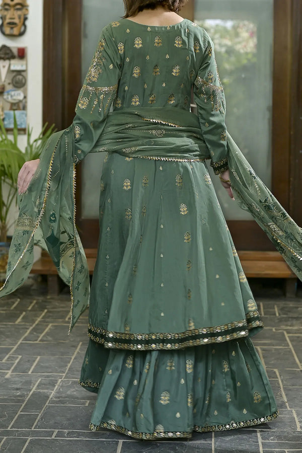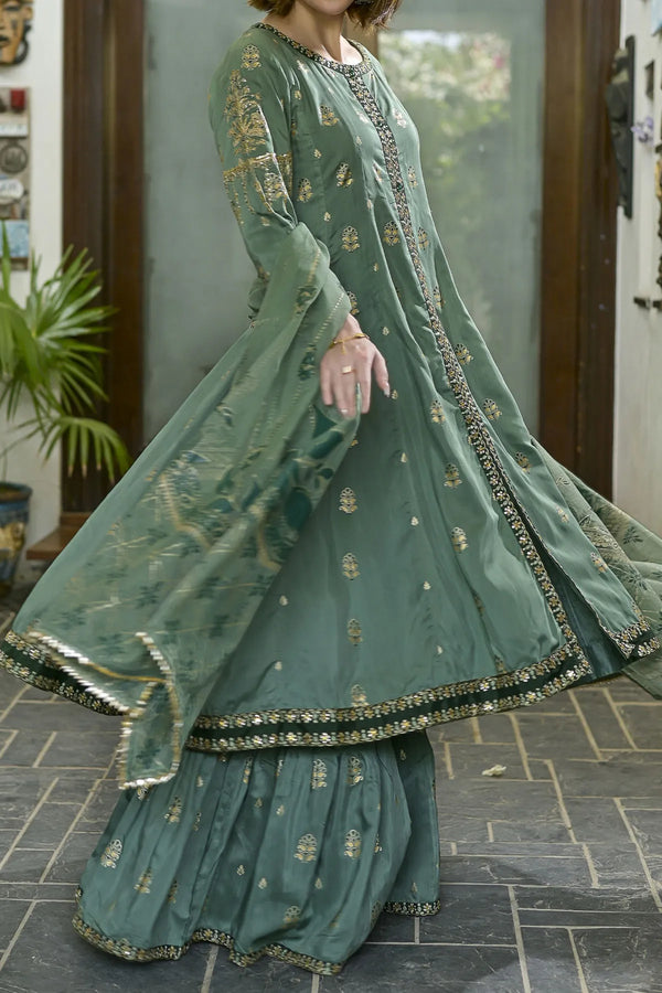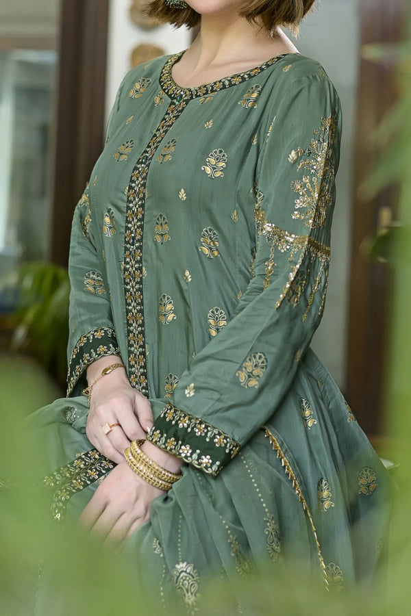 Let this sage green outfit, with hints of velvet glamour, exude an aura of timeless allure. The meticulously screen-printed frock, a masterpiece in itself, features velvet embroidered border details. Light gold cupped sequins, like aster petals, catch the light and whisper of forgotten wishes. A meticulously designed dupatta, a dreamlike cascade of elegance, completes the ensemble, carrying you to the heart of any occasion.