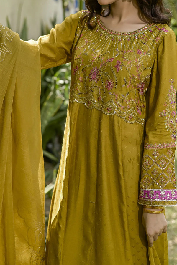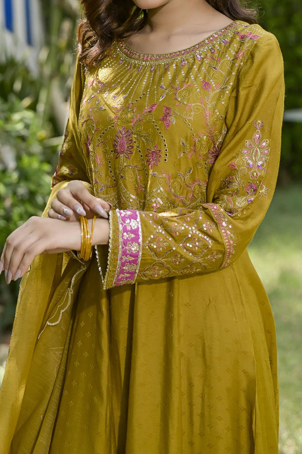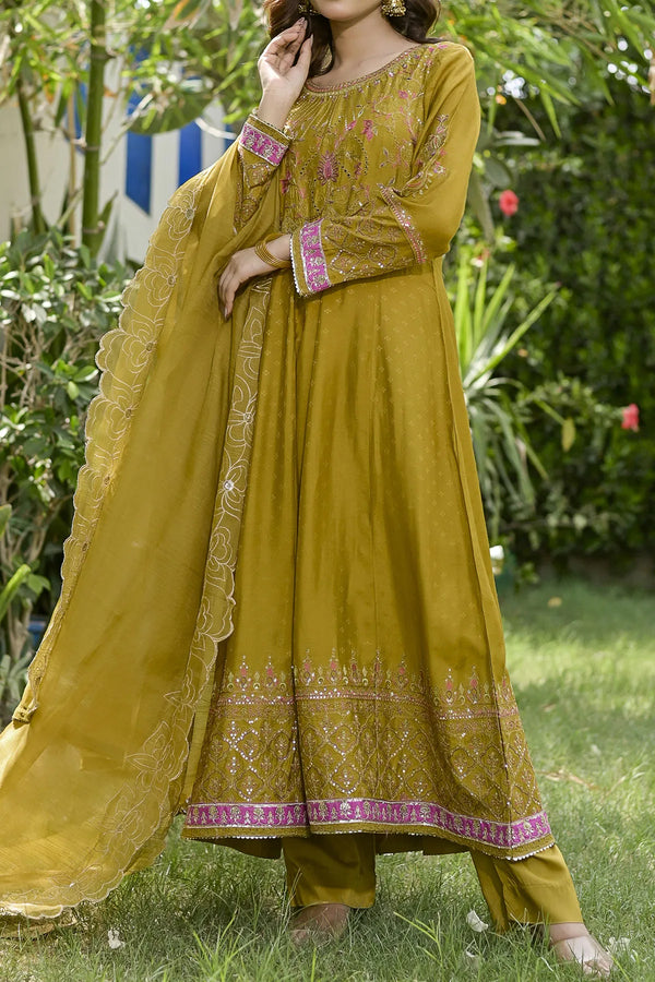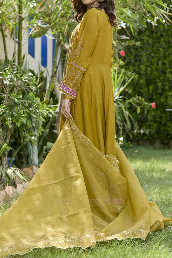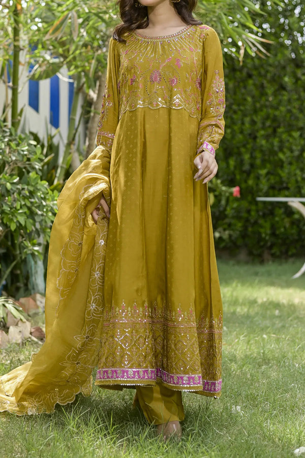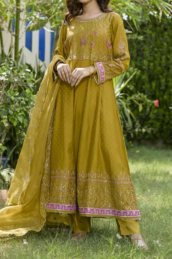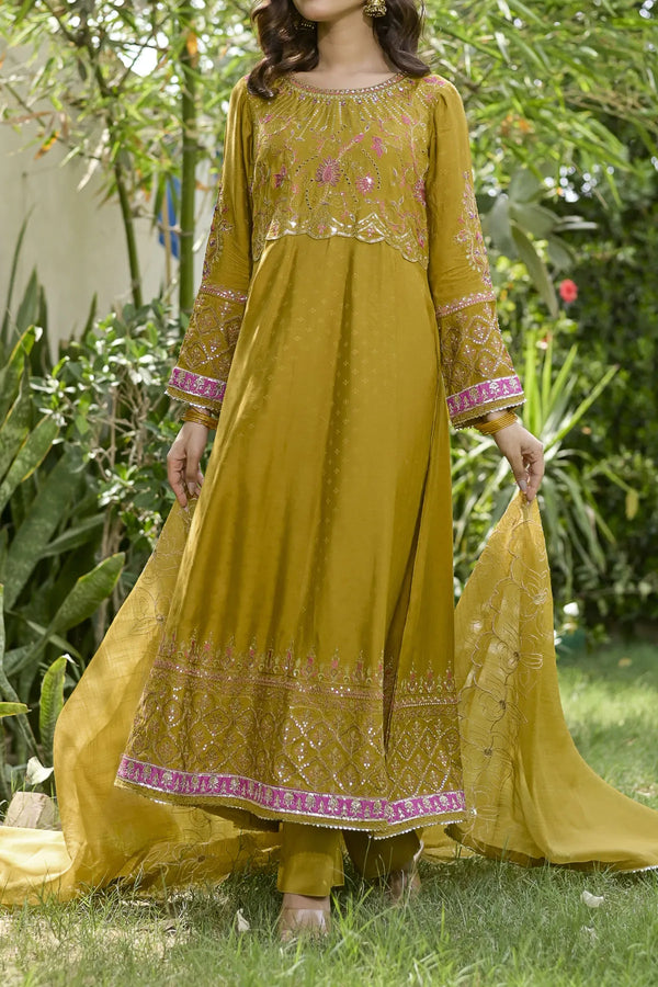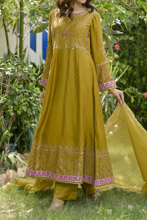 Embrace the majestic vibe of this beautiful ensemble, adorned with antique gold zari and sequins, creating a splendorous display of intricate embroidery. The embroidered frock showcases opulence in every stitch. Enhanced with heavy Damn with contrast color highlighting, the beautifully design duppata add the richness in the design. This design is a regal masterpiece.