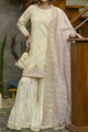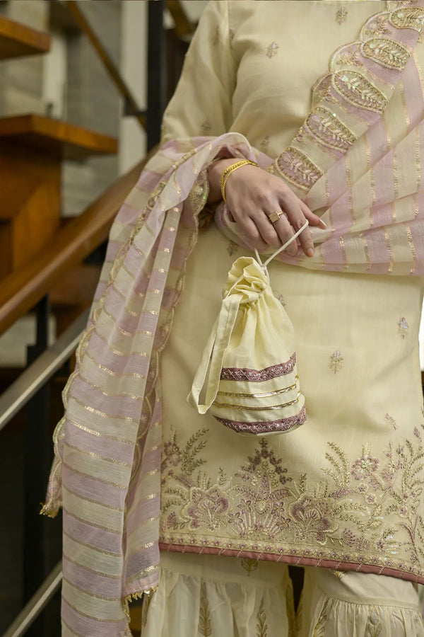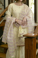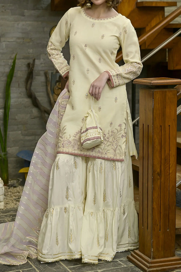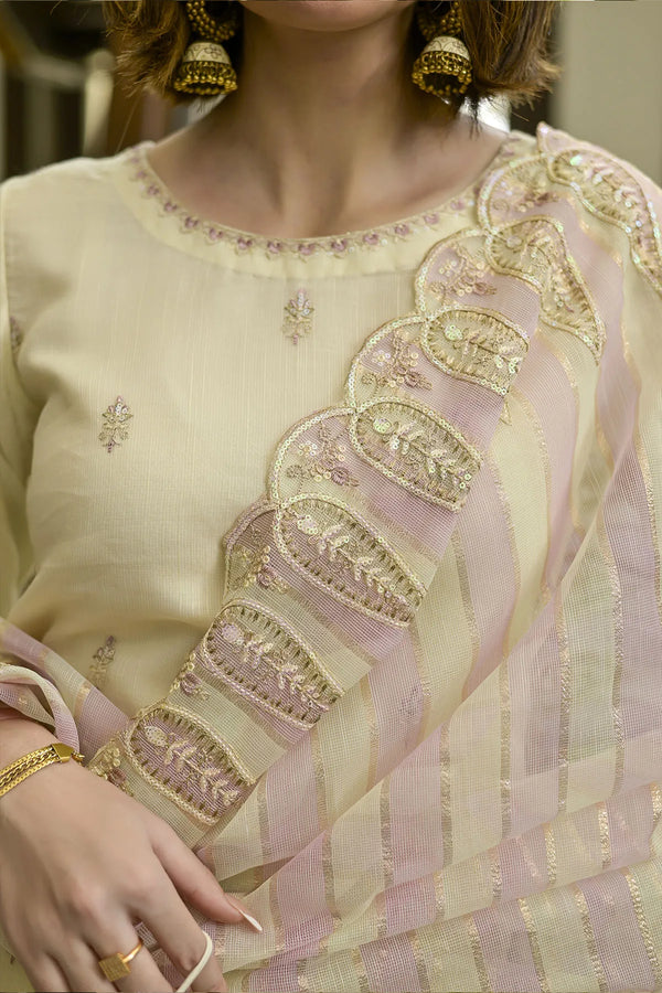 A rich composition is portrayed on this elegant ensemble rendered in powder pistachio slub. The classic shirt is gracefully adorned with aesthetically rich, intricate embroidery with fascinating designs illustrated in smooth hues, enhanced with screen printing details, three layers of grara. Paired with a beautiful design fabrication dupatta, this beautiful outfit is a style statement for fun gatherings this Eid season.