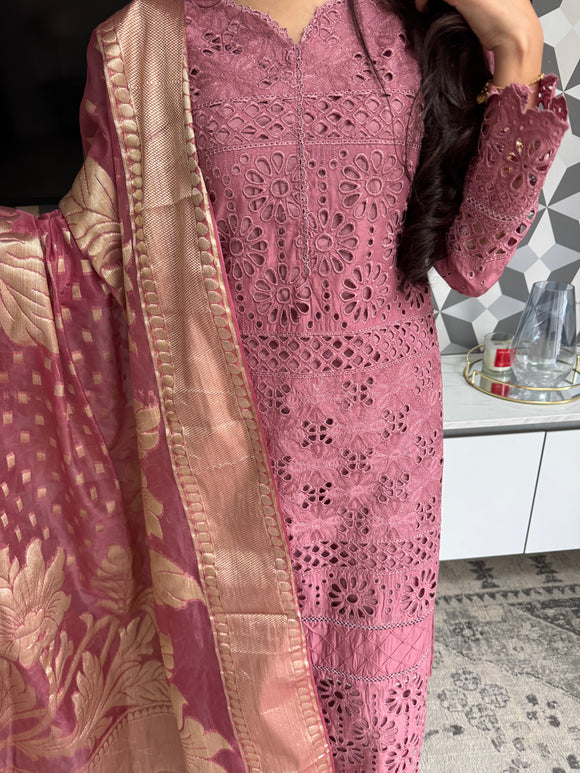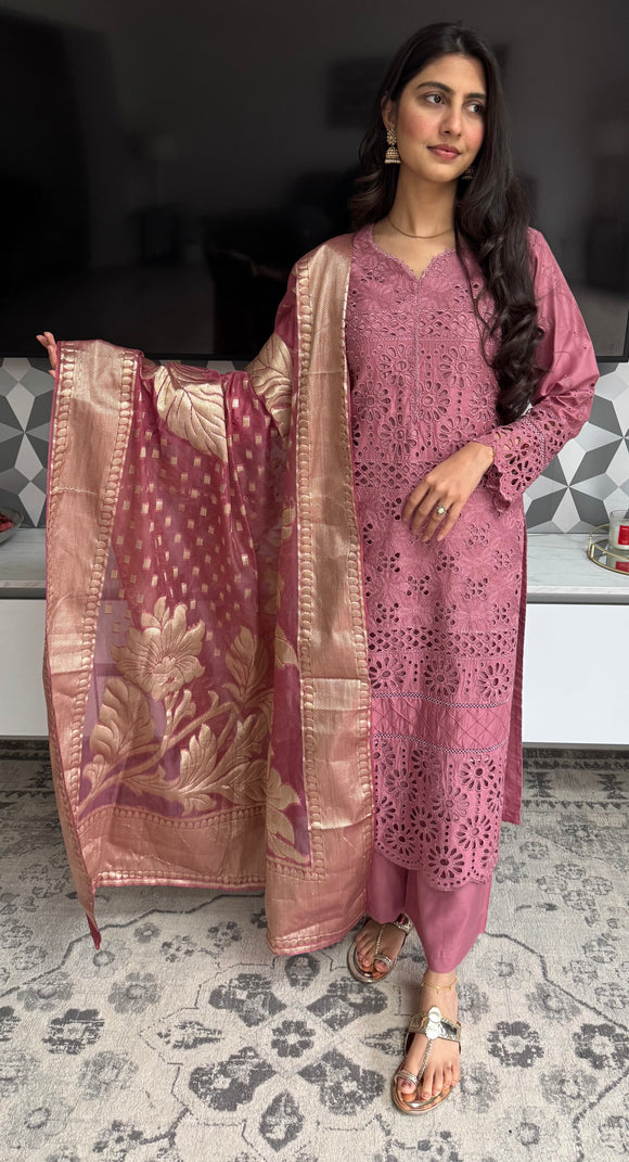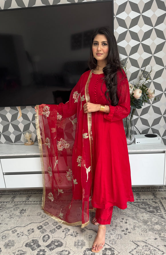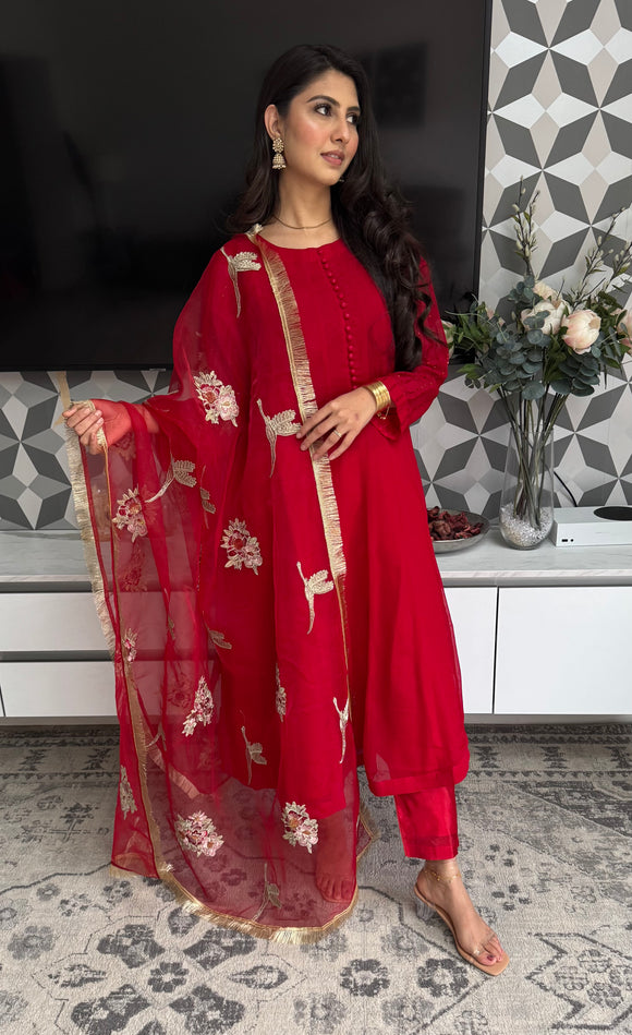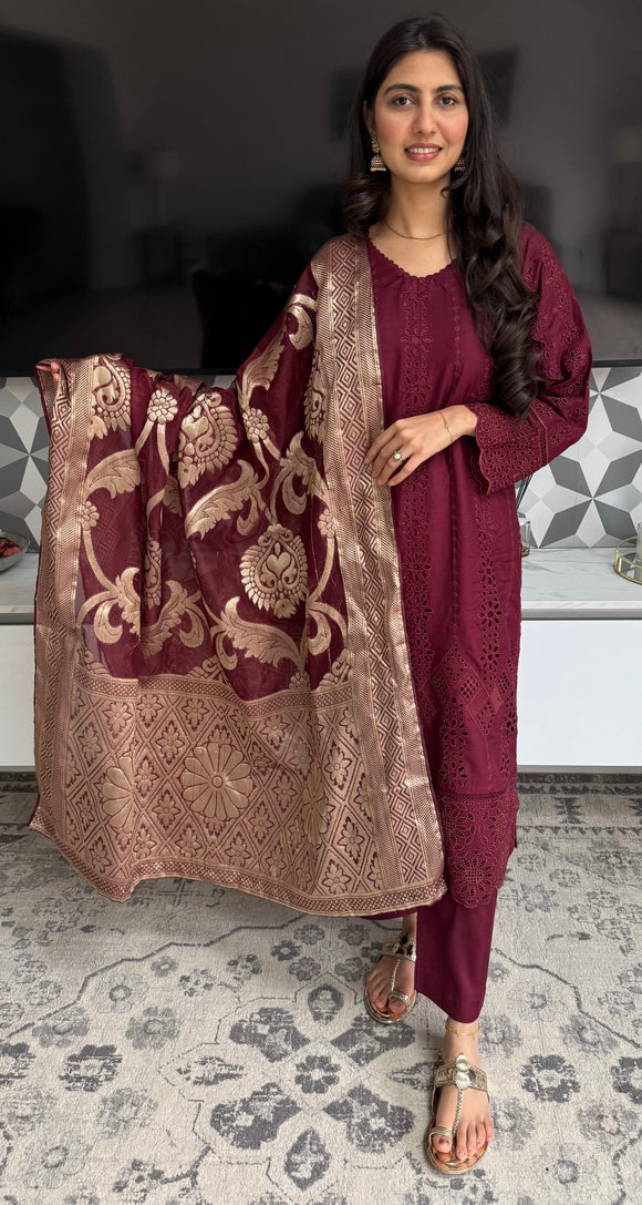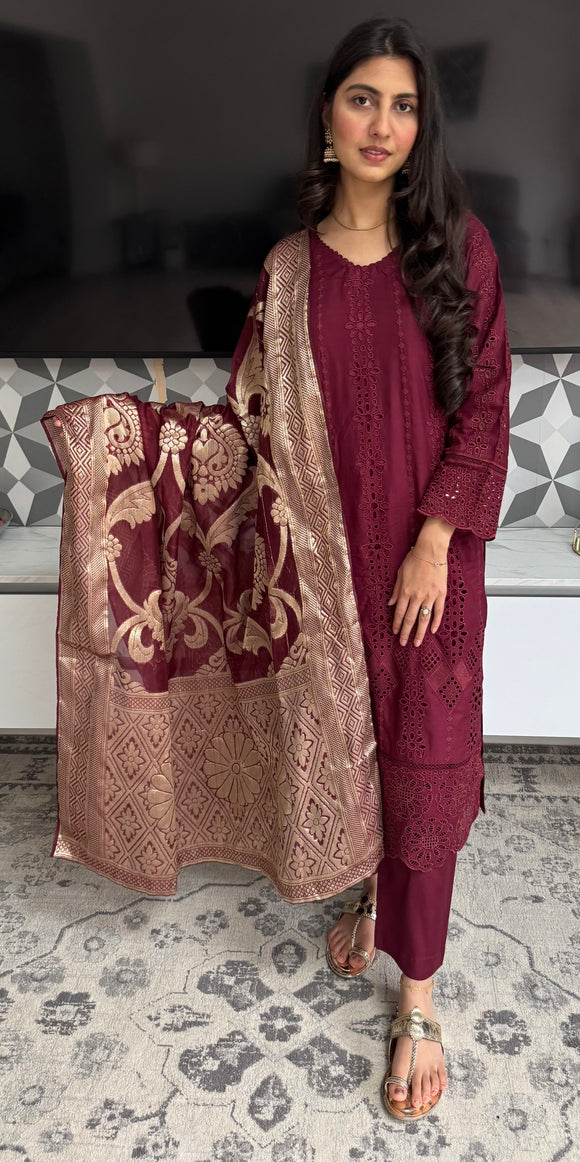 Chickan Kari with Banarsi Dupatta - Deep Red