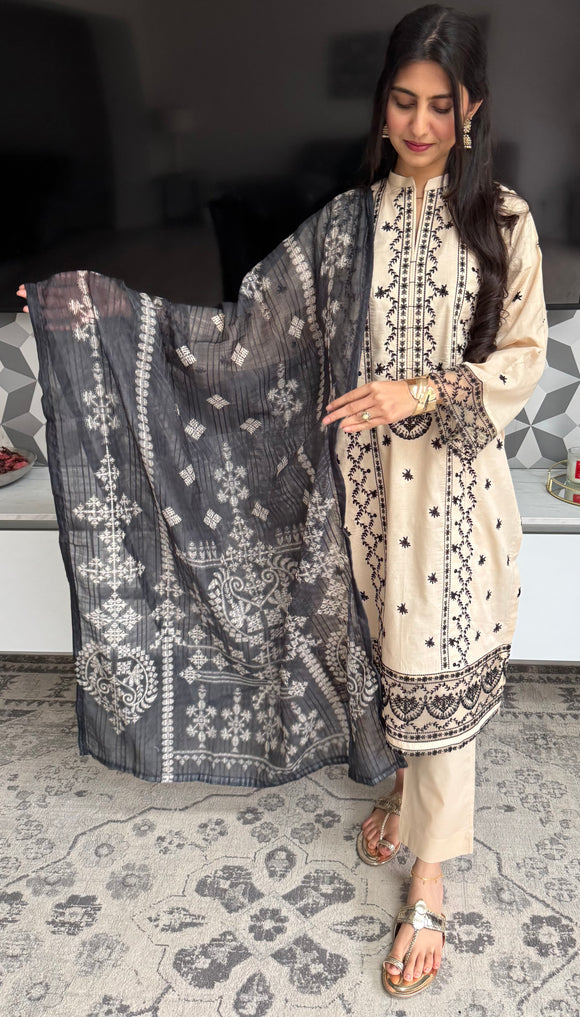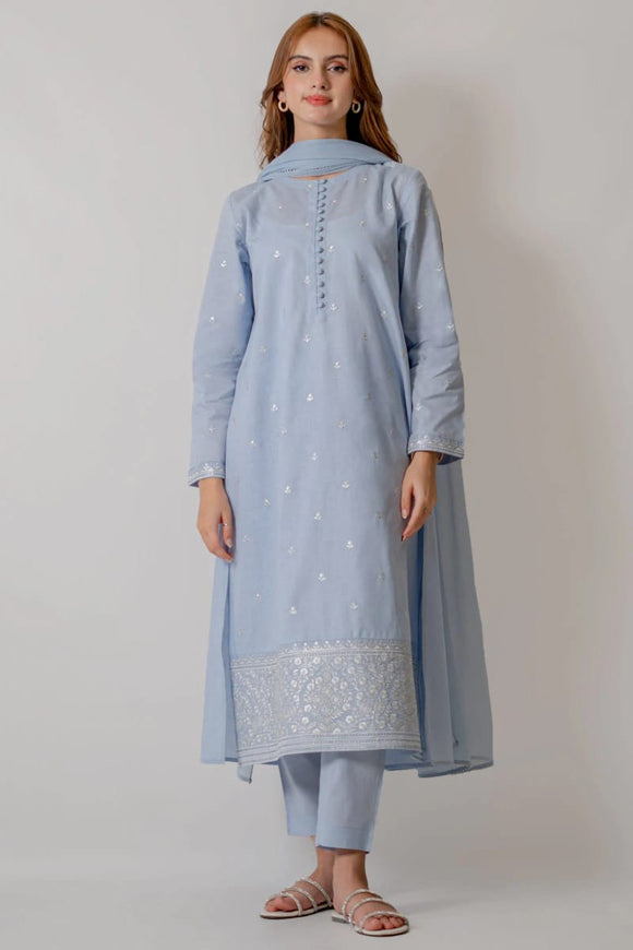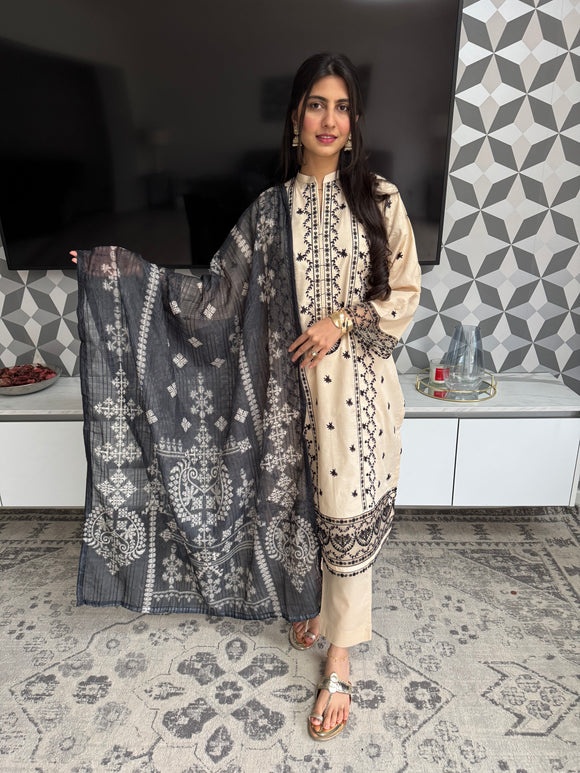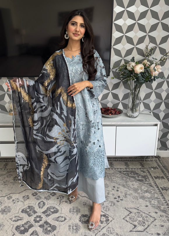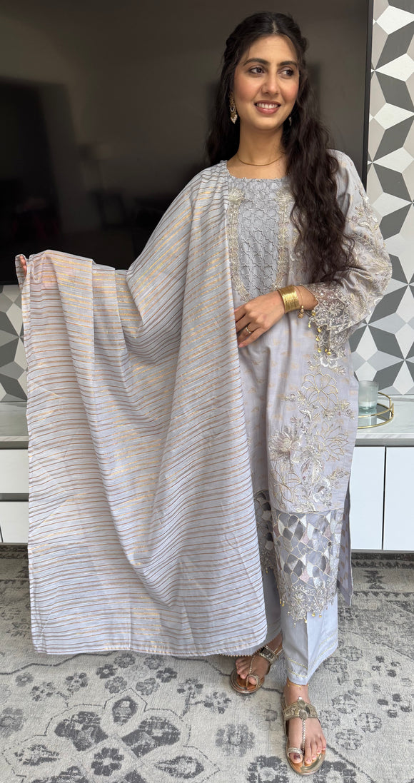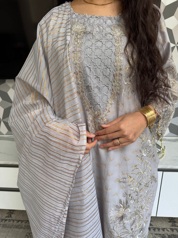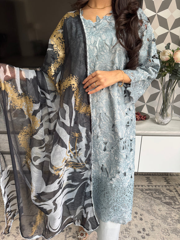 'Imaani' 3 Pc Chickan Kari with Printed Dupatta - Grey