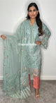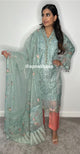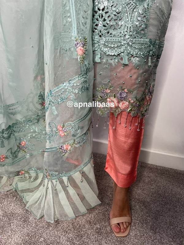 A beautiful Maria B Inspired Master Replica with sequence work throughtout the kameez and intricate detailing on the neckline and the sleeves. Comes with a organza detailed dupatta and a contrasted Capri Trouser.